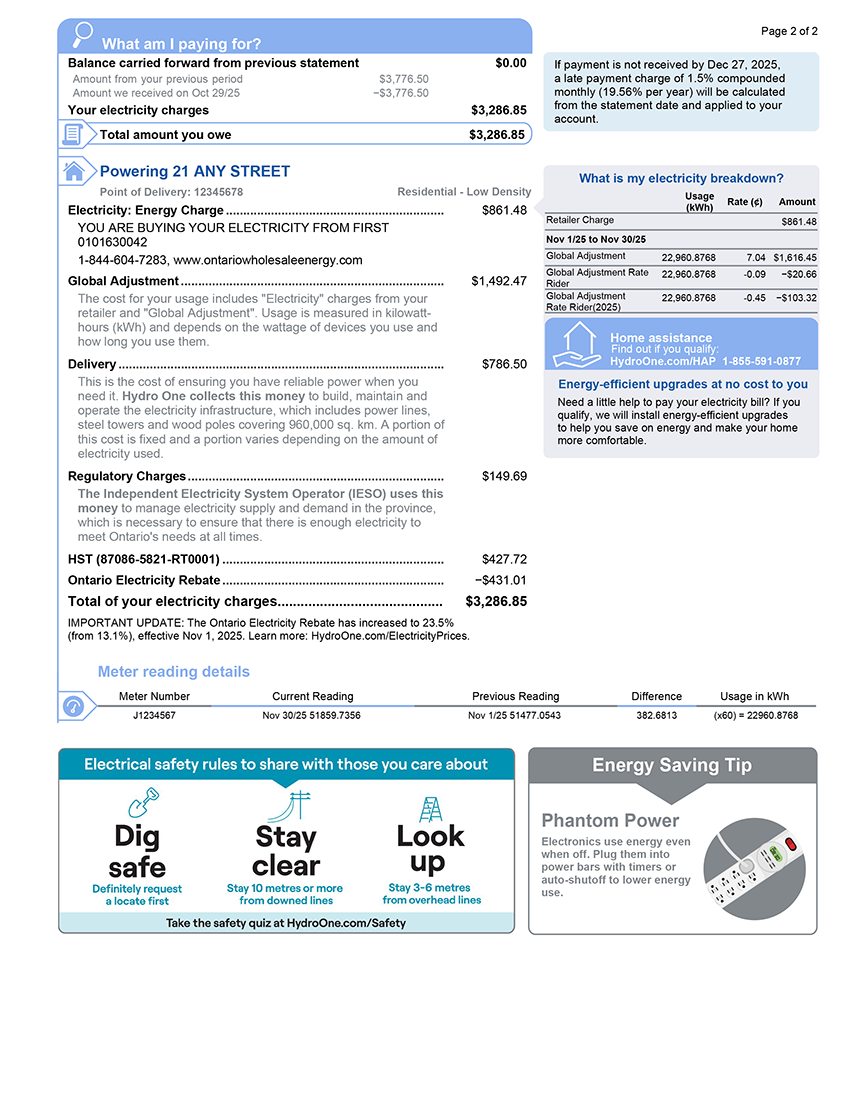 If you choose to sign with an electricity retailer or pay the spot market pricing, Hydro One will continue to bill you for "Delivery", "Regulatory", "Global Adjustment" and other applicable taxes and charges.